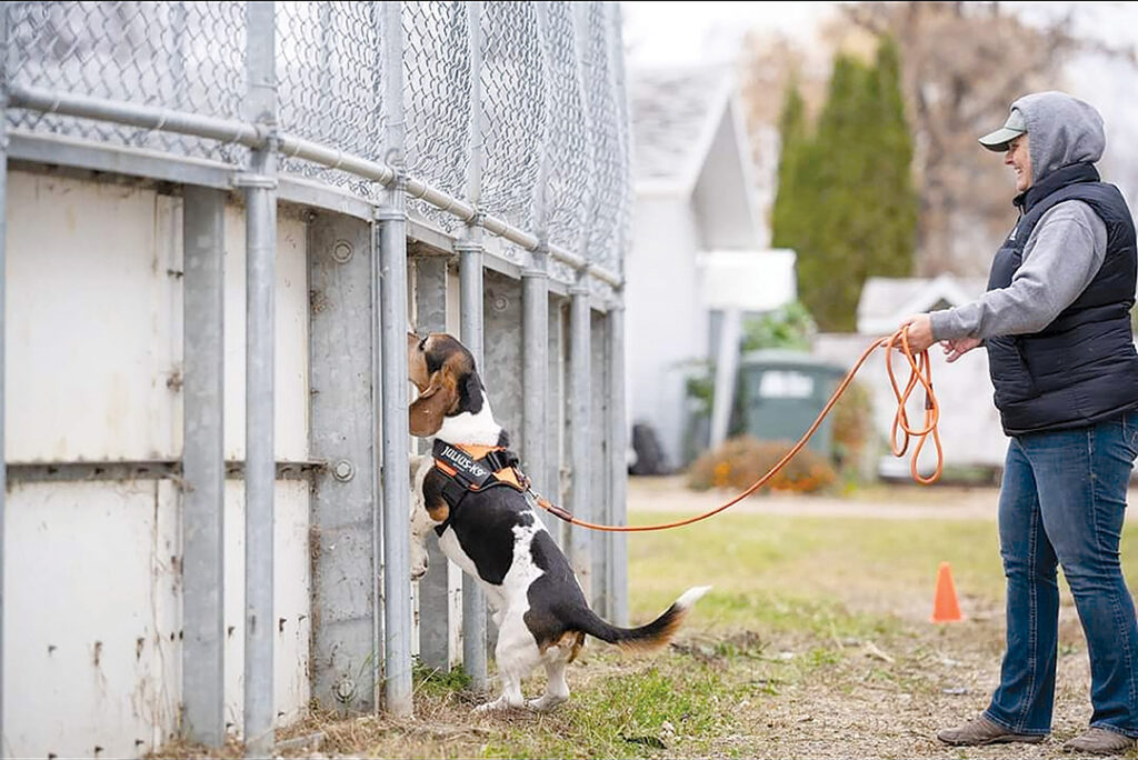 A fun exercise in leash handling is to attach the leash to another handler and have them act as the “dog”! The “dog” will make their way around a room with a variety of objects in it. The “dog” role will speed up, slow down, and make sharp and tight turns to mimic a dog searching for odour. This exercise is valuable to both ends of the leash. The handler end of the leash will get comfortable manipulating a leash and the “dog” role has a chance to feel what it is like to be restricted by poor leash handling. You will soon see how important it is for the two ends of the leash to work together and operate as one unit.
