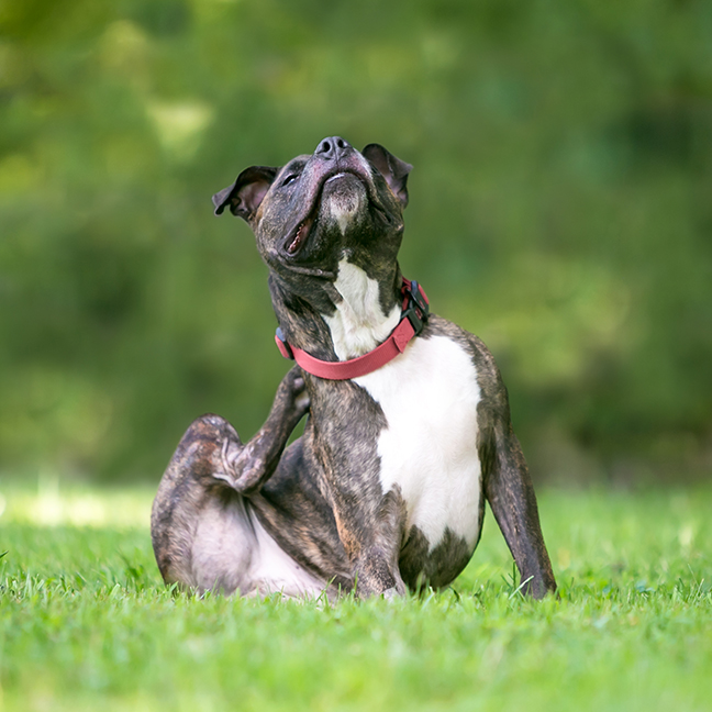 When a dog scratches or starts licking itself, it could be a displacement behaviour. Assess the situation, your dog could just be itchy or have allergies.
