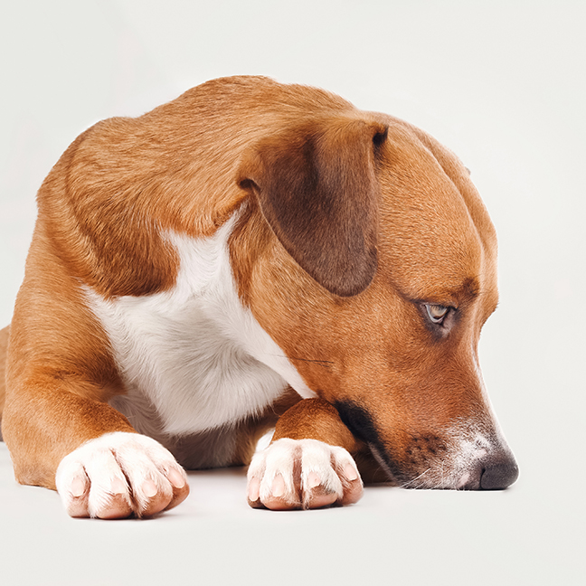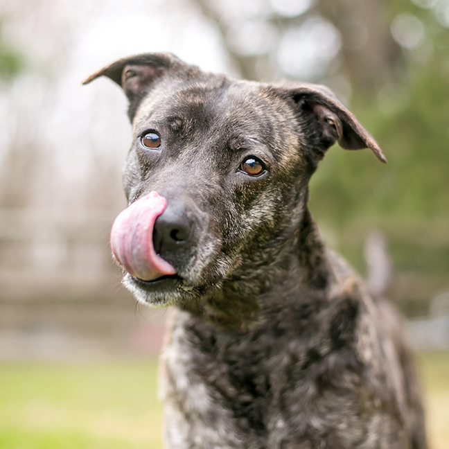 A dog darting their tongue in and out, especially if it curls up to their nose, can be a sign of stress.